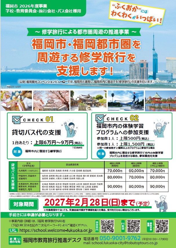 (公財)福岡観光コンベンションビューローでは、福岡市と連携し、福岡市内に宿泊する修学旅行へのバス代や体験学習プログラムの参加費支援を、令和8年度も昨年度に引き続き実施します。