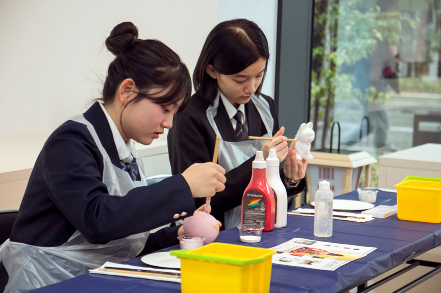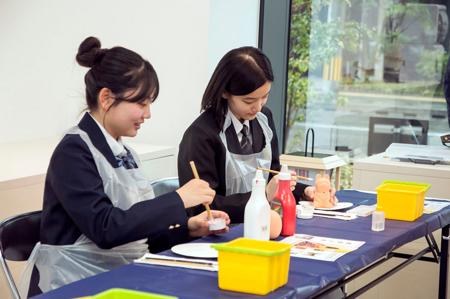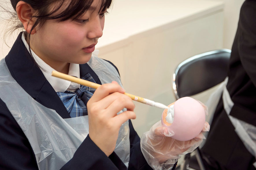 はかた伝統工芸館では、展示見学に加えて伝統工芸を体験できるワークショップも行われています。今回は、修学旅行の体験学習として博多人形の絵付け体験を行いました。