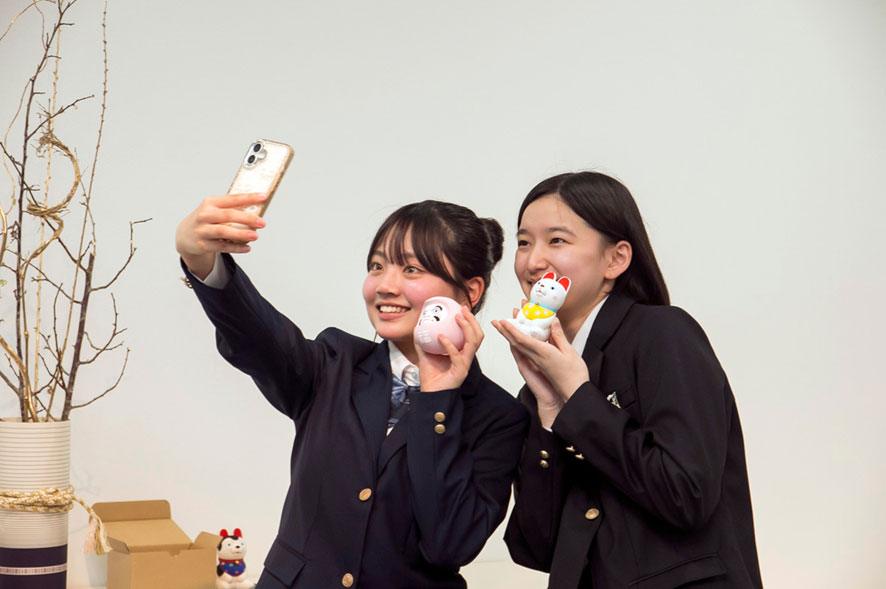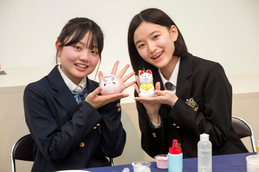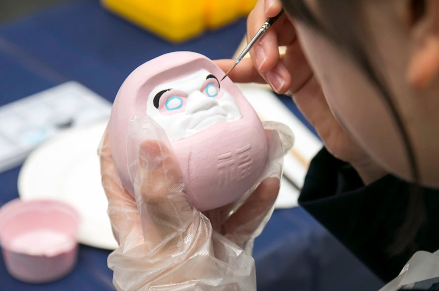 「最初はできるか不安でしたが、先生が“自由に好きなように描いていいよ”と言ってくれたので安心しました。好きな色やメイクを取り入れて、運気が良さそうなだるまの博多人形になりました。博多人形が縁起物だということも学び、完成した人形は家に飾りたいと思います。」