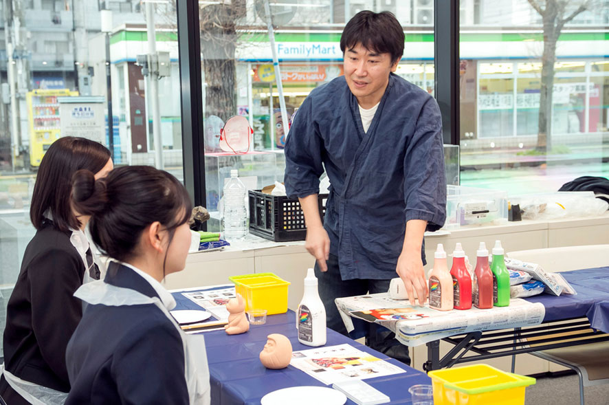 体験の最初に、博多人形の歴史や特徴について説明を受けます。今回は博多人形伝統工芸士の野田先生から、絵付けのポイントや楽しみ方を教えていただきました。